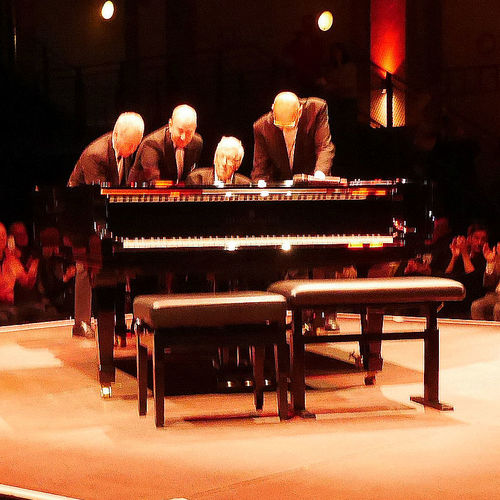 Beim Finale wechseln die 4 Musiker wie beim Tischtennis-Rundlauf ihre Plätze. Sie müssen sich ganz schön beeilen, weil die Musik im Up-Tempo läuft. Sie spielen mal im Sitzen, mal im Stehen, mal zu dritt, mal zu viert an einem Piano. Insgesamt mehr als drei Stunden hat dieses Konzert gedauert, das mit standing ovations abschloss und das man nicht so schnell vergessen wird.