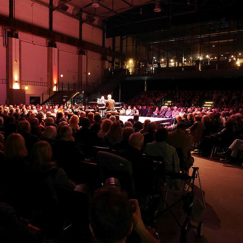 Die Bühne könnte auch an einen Boxring erinnern, doch eine ‚Battle‘ ist hier nicht geplant, es geht vielmehr um den ‚International Stride & Swing Piano Summit‘. Der Bühnenaufbau, bei dem die vier Zuschauer-Blöcke sehr nahe an die Bühne heranreichen, soll dem ganzen Publikum einen guten Blick auf die Pianisten mit ihren Instrumenten bieten.