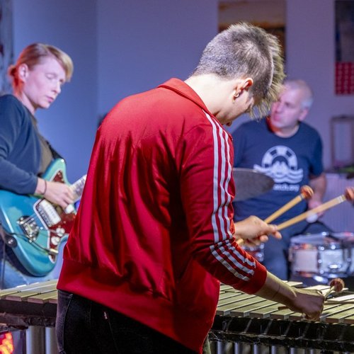 Raissa Mehner an Gitarre und elektronischen Effektgeräten, Salome Amend am Vibraphon und Simon Camata am Schlagzeug verbergen sich hinter dem ungewöhnlichen Namen. Die drei haben 2023 auf dem Moers Festival zum ersten Mal zusammen gespielt, Open Air am Rodelberg.