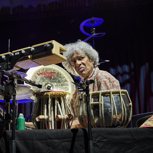 Der indische Drummer und Perkussionist Trilok Gurtu ist ebenso wie der Bandleader ein legendärer Musiker und Weltstar. Der 1951 in Bombay in einer musikalischen Familie geborene Trilok Gurtu hat zuerst mit Charlie Mariano zusammen gespielt. Dann spielte er bei den Münchener Jazzrock und Ethojazz Pionieren Embryo und mit Don Cherry. Von 1984 bis 1988 war Nachfolger von Collin Walcot in der Band Oregon. Ab 1988 war er dann vier Jahre lang Mitglied der John Mc Laughlin Band. Er spielte mit vielen Größen des zeitgenössischen Jazz zusammen, aber gleichzeitig spielte er auch mit indischen Musikern klassische nordindische Musik. Er steht wie kaum ein anderer Musiker für die Verbindung von westlicher und östlicher Musik. Das zeigte sich auch an seinem Drumset für das Konzert in Bonn, neben einem westlichen Schlagzeug, befanden sich dort Tablas, Gongs und weitere Perkussionsinstrumente. Aber Gurtu hatte auch einen Eimer mit Wasser auf seinem Set stehen, in den er verschiedene hallende Gongs tauchte um besondere Klangeffekte zu erzielen.