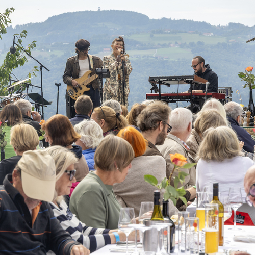 Zu gutem Jazz passt ja auch irgendwie guter Wein. Beides hat Leibnitz zu bieten. Manch edler Tropfen aus der Region hat internationales Spitzenniveau. Und so trägt das Jazzfestival den Zusatz „Jazz & Wine“ gerne und voller Stolz. An den beiden Festivalabenden, die im Kulturzentrum der Stadt stattfinden, laden Winzer der Region immer zur Verkostung ihrer Weine vor den Konzerten ein. Und der letzte musikalische Ton erklingt bei dem viertägigen Festival immer beim Open Air-Brunch-Konzert bei einmal mehr sonnigem Wetter vor einem wunderschön gelegenen Weingartenhotel. Die italienische Alternative Soul-Sängerin Naima Faraò macht dort mit ihrem Quartett und ihrer starken Stimme und modernen Soulstücken, darunter auch Nummern von Erykah Badu oder Joe Armon-Jones, viel Spaß und sorgt für einen sehr unterhaltsamen, energievollen Ausklang eines wieder einmal rundum überzeugenden Jazz Festivals Leibnitz.