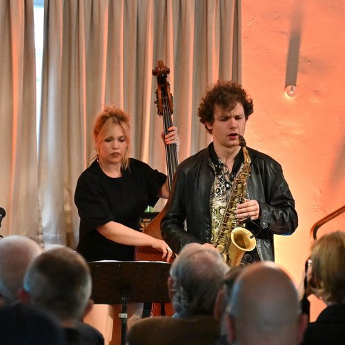 Aber dann entdeckte sie bei einem Ausflug die bayrischen Alpen und bekam ein Heimatgefühl. Diese Erfahrung hielt sie musikalisch in dem Titel An Answer from a distant Hill fest. Jakob Manz spielte hier statt des Altsaxophons die Blockflöte, aber ebenso expressiv wie sein Saxophon. Neben der wunderbaren Pianistin brillierte besonders Jakob Manz mit seinen Saxophon- und Flötensoli. In dem Stück war auch ein herausragendes Duo von Caris Hermes am Bass und Leo Asal an den Drums zu hören. Das deutlich zeigte, welch großartige Rhythmusgruppe hier auf der Bühne war.