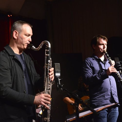 Es gab viele bemerkenswerte Momente während des Konzertes, herausragende Soli, stimmungsvolle Duos, etwa von Thomas Savy an der Bassklarinette mit Gina am Kontrabass, oder ein Klarinetten Duo von Annette Maye mit Clemens Salesny. Aber auch die klassische Klaviertrio Konstellation mit Lucas Leidinger , Gina am Bass und Dirk Peter Kölsch an den Drums hatte ihren Reiz. Aber ganz besonders in den Ensemble Tuttis kamen die vielen Klangfarben des Oktetts plus Bass in ganzer Fülle zur Geltung.