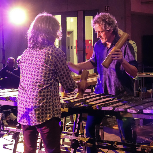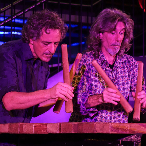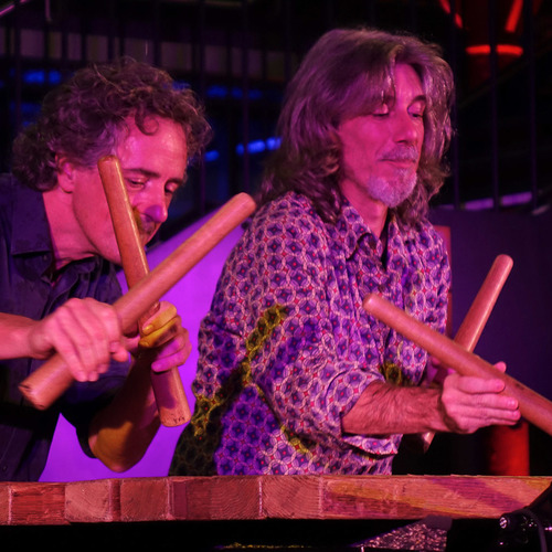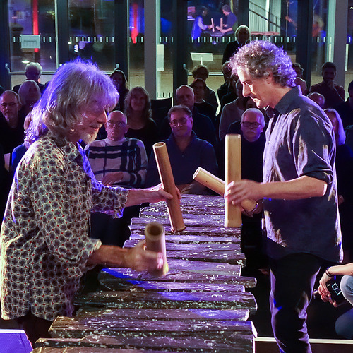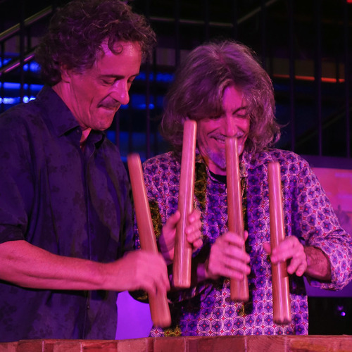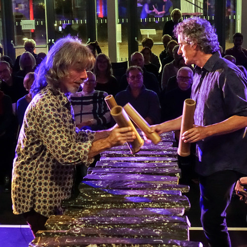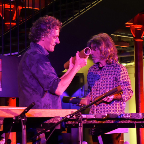 Die sorgfältig zugeschnittenen Hartholzpaneele sind exakt in Bezug auf eine Tonhöhe bemessen – aus dem ursprünglich rein rhythmischen Instrument wird ein melodisches Werkzeug. Die Schieferblöcke daneben eignen sich mit ihrer größeren Resonanz besonders gut für Tonfolgen und Harmonien, wenn die beiden Musiker Akkordbrechungen spielen. Das Material selbst wird zum Klangcharakter: Holz perkussiv-präzise, Schiefer nachklingend-atmosphärisch.