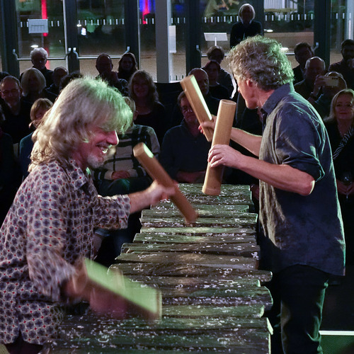 Zwei Männer wirbeln tänzerisch über die Bühne, in den Händen schwere Holzstäbe, die Körper in ständiger Bewegung. Vor ihnen liegen massive Hartholzpaneele und Schieferblöcke, aufgereiht wie die Tastatur eines riesigen, archaischen Instruments. Der erste Schlag fällt – ein trockener, präziser Klang mit definierter Tonhöhe. Der zweite antwortet, eine Terz höher, während beide Musiker ausgelassen von einem Ende ihrer Klanginstallation zum anderen springen. Die Schläge verdichten sich zu Texturen, zu rhythmischen Mustern, zu harmonischen Clustern manchmal – ein vielstimmiges, pulsierendes Gewoge. Was hier entsteht, ist kein bloßes Schlagwerk, sondern ein rhythmischer Dialog voller körperlicher Energie – und der hat seinen Ursprung in uralter Arbeitskultur aus dem Baskenland. Bei der traditionell berühmten Apfelwein-Produktion in dieser Region werden die Äpfel mit genau solchen Hölzern zerstampft, und aus dem gemeinsamen Tun erwuchs ein kollektiver Rhythmus, der irgendwann musikalisch genutzt wurde. Die Geburtsstunde dieser archaischen, in Bocholt bestaunten Instrumente war vollzogen. Die Zusammenarbeit im Rhythmus wurde zum sozialen Ritual, bei dem sich die Schläge zweier Arbeiter zu komplexen polyrhythmischen Mustern verdichteten.