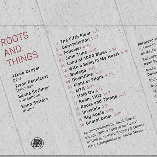 Mit sechs Kompositionen und einem Jazz-Standard schafft der Kontrabassist Jakob Dreyer auf seinem neuen Album "Roots and Things" eine faszinierende Balance zwischen konzentrierten Momentaufnahmen und ausgedehnten musikalischen Erzählungen. Die kurzen Interludien fungieren als emotionale Atempausen, während das Vibraphon von Sasha Berliner dem Ganzen eine unverwechselbare klangliche Signatur verleiht – mal perkussiv treibend, mal atmosphärisch schwebend. Besonders mutig: Dreyers Neuinterpretation des Rogers-Klassikers "With a Song in My Heart" im 5/4-Takt, die mit der schmalzigen Vergangenheit des Musicalstücks radikal bricht. Vorab wurden inzwischen 2 Stücke veröffentlicht: ‚Downtime‘ und ‚Fight for Flight‘.